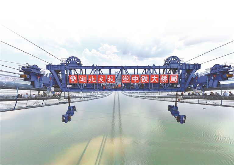 那就自己創(chuàng)造經(jīng)驗!湖北交投牽頭聯(lián)合承建單位,在大橋建設(shè)前期進行了大量數(shù)據(jù)論證和可行性試驗,一次次研究優(yōu)化施工方案。他們堅持設(shè)備優(yōu)化與工藝創(chuàng)新“雙管齊下”,應(yīng)用纜載吊機、液壓提升裝置等裝備創(chuàng)新施工方法,順利攻克了難關(guān)。