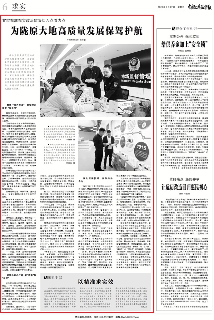 政治監(jiān)督是實現(xiàn)黨的政治路線的重要保障,是督促全黨堅持黨中央集中統(tǒng)一領導的有力舉措。甘肅堅決扛起政治監(jiān)督的職責使命,制定加強政治監(jiān)督的實施意見,深化系統(tǒng)治理,推動黨中央決策部署和習近平總書記重要指示批示精神落地落實,為經(jīng)濟社會高質(zhì)量發(fā)展提供堅強保障。