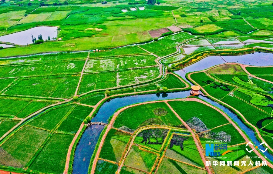 這是7月13日在甘肅省張掖市甘州區(qū)烏江鎮(zhèn)航拍的稻田景觀。新華網(wǎng)發(fā) (王將 攝)