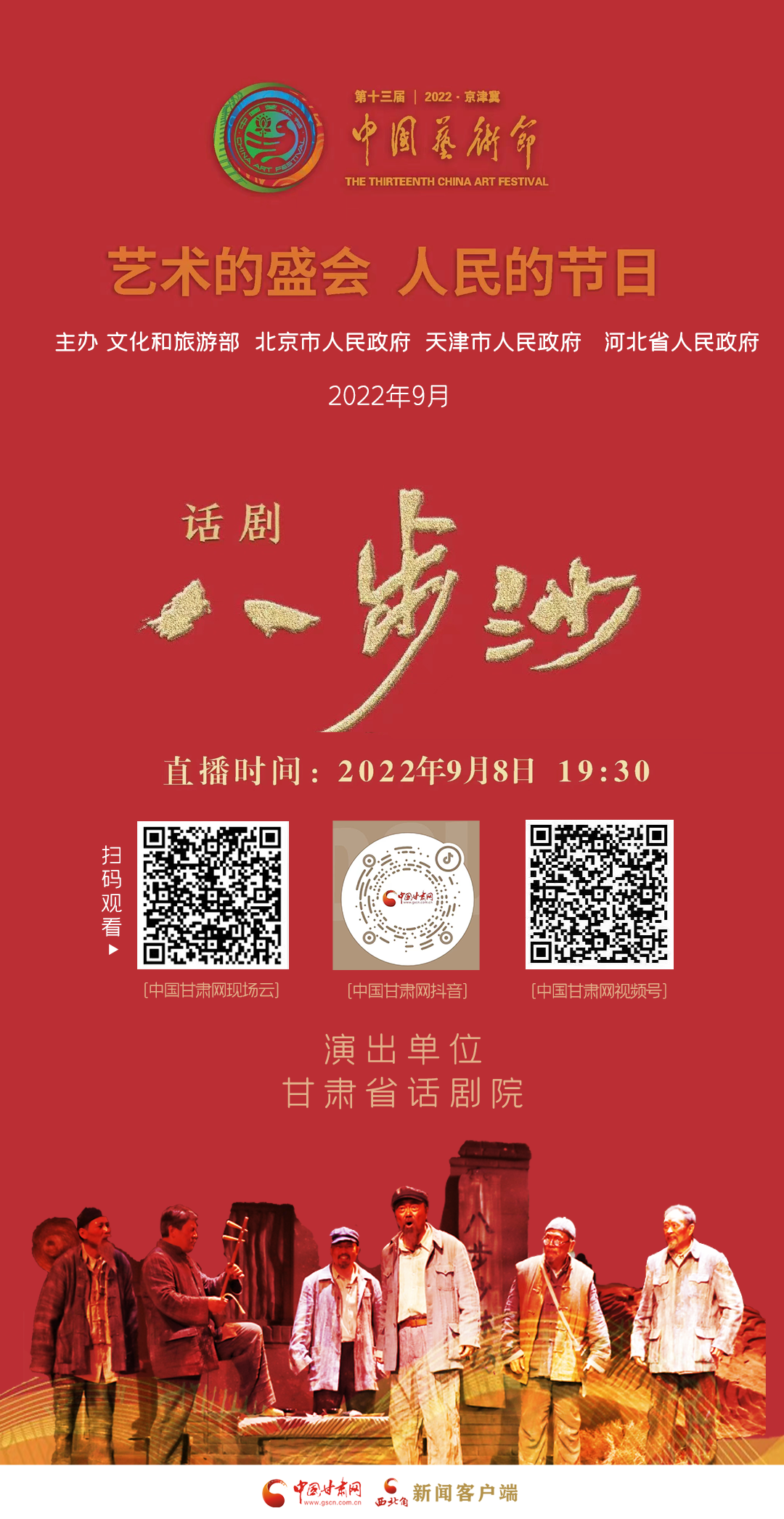 9月1日,由文化和旅游部、北京市政府、天津市政府、河北省政府共同主辦的第十三屆中國藝術(shù)節(jié)在北京開幕。隨著藝術(shù)節(jié)大幕徐徐拉開,劇目展演和“文華獎”評審工作同步展開,入圍第十七屆文華大獎終評作品的話劇《八步沙》將代表甘肅省,與全國新創(chuàng)排的38部舞臺藝術(shù)作品一起角逐最終的文華大獎。根據(jù)疫情防控要求,話劇《八步沙》將以線上評審的方式參演,期待廣大觀眾屆時觀看并點評。