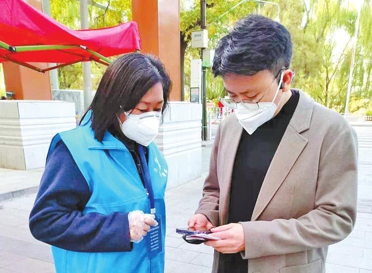 薩仁娜認真查驗小區(qū)進出人員健康碼
