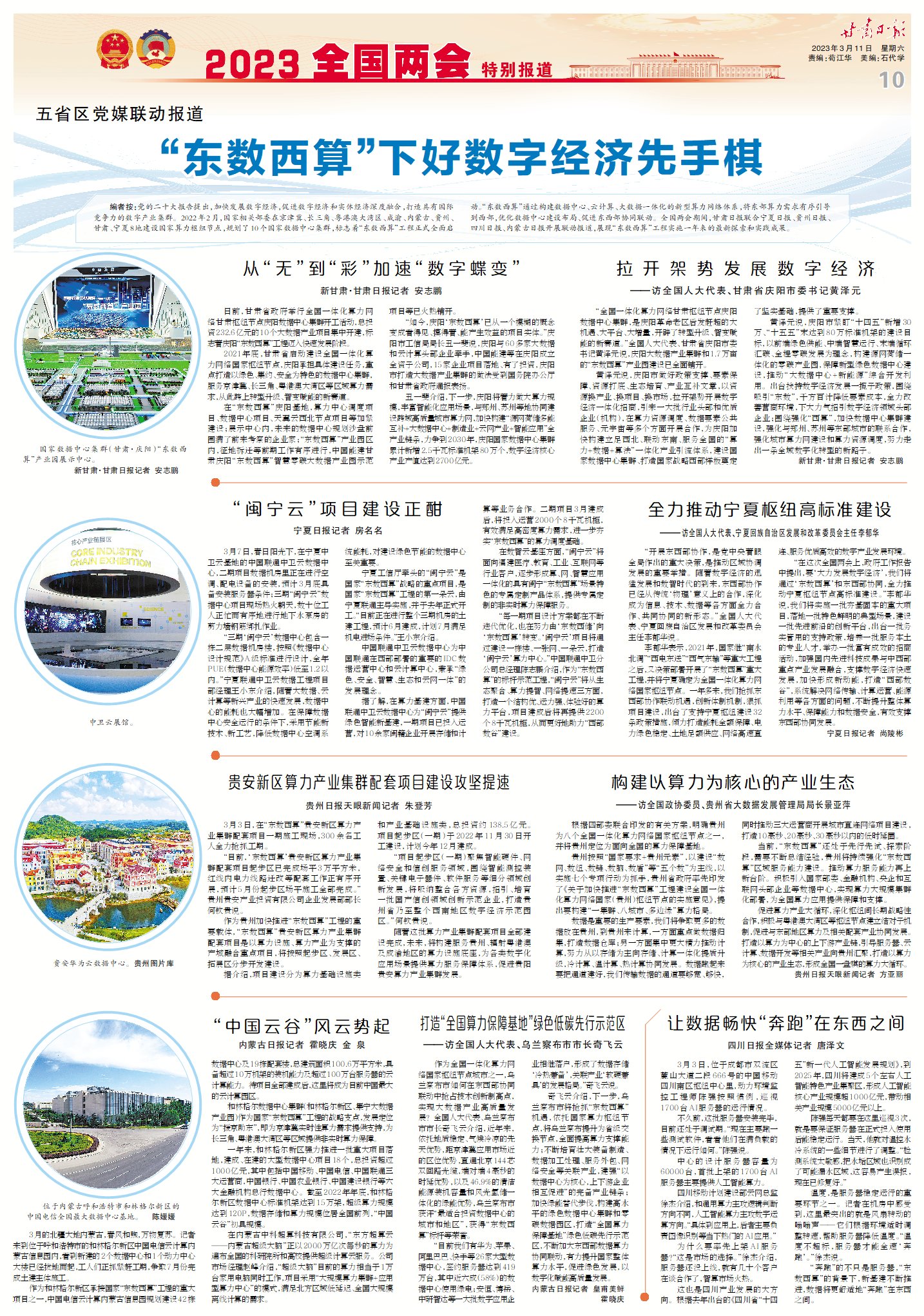 編者按:黨的二十大報告提出,加快發(fā)展數(shù)字經(jīng)濟,促進數(shù)字經(jīng)濟和實體經(jīng)濟深度融合,打造具有國際競爭力的數(shù)字產(chǎn)業(yè)集群。2022年2月,國家相關(guān)部委在京津冀、長三角、粵港澳大灣區(qū)、成渝、內(nèi)蒙古、貴州、甘肅、寧夏8地建設(shè)國家算力樞紐節(jié)點,規(guī)劃了10個國家數(shù)據(jù)中心集群,標志著“東數(shù)西算”工程正式全面啟動。“東數(shù)西算”通過構(gòu)建數(shù)據(jù)中心、云計算、大數(shù)據(jù)一體化的新型算力網(wǎng)絡(luò)體系,將東部算力需求有序引導(dǎo)到西部,優(yōu)化數(shù)據(jù)中心建設(shè)布局、促進東西部協(xié)同聯(lián)動。全國兩會期間,甘肅日報聯(lián)合寧夏日報、貴州日報、四川日報、內(nèi)蒙古日報開展聯(lián)動報道,展現(xiàn)“東數(shù)西算”工程實施一年來的最新探索和實踐成果。
