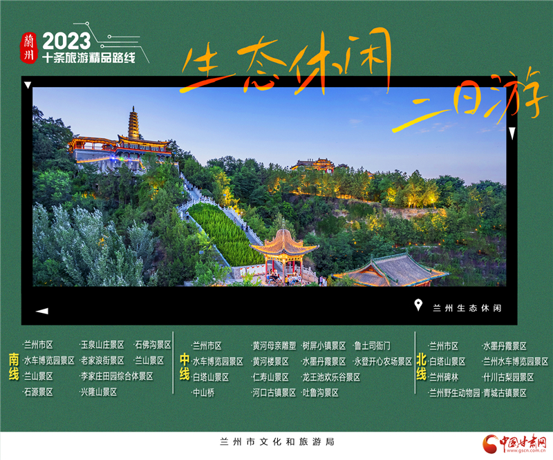 3.蘭州生態(tài)休閑2日游。這里有蘭山景區(qū),泡一壺茗茶覽金城夜景;這里有玉泉山莊,約三兩摯友慢品農家風味;這里有李家莊田園綜合體,瓜田李下享天倫之樂;或者直接遁入興隆山,隱入深山自逍遙,當半日山居隱士。“蘭州生態(tài)休閑2日游”三條線,分別為南線、中線和北線。