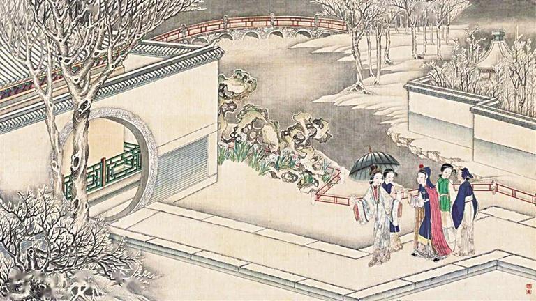 著名紅學(xué)家周汝昌曾評(píng)論清代孫溫《紅樓夢》繪本是“紅樓瑰寶”,其中一處細(xì)節(jié)就配得上這種評(píng)論。賈政攜寶玉和眾客游覽大觀園的繪制中,孫溫用了13幅畫并以焦點(diǎn)游移的手法,一路將賈政等人的路線詳細(xì)描繪出來,跟著畫面而走,觀者可以看到瀟湘館、蘅蕪院、沁芳亭、沁芳橋等大觀園景觀,令人嘆為觀止。