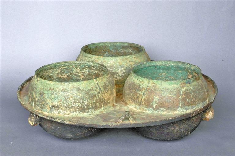 1979年,靈臺縣獨(dú)店鎮(zhèn)中慶村飲馬嘴漢墓出土了一件類似火鍋的連體三釜銅灶。通高16.4厘米,釜口徑分別為17厘米、17.4厘米、16.7厘米。三連釜,用九塊范鑄成。三釜均斂口,圓唇,球腹,圜底。圓盤窄沿,盤面近沿處分別置三個(gè)三角形掛鈕,盤下三釜外側(cè)各有一支釘,釜底有煙炱。從盤面間三系看,可供吊掛,盤陰三個(gè)支臺,可用于支撐,顯然有流動(dòng)使用的功能。三個(gè)釜可同時(shí)烹煮不同食物,圓盤還可烘烤其他食品。老百姓俗稱三釜銅“火鍋”,但該銅灶是否為火鍋還需要進(jìn)一步考證。