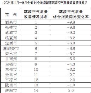 2024年1月—9月,全省14個地級城市環(huán)境空氣質(zhì)量綜合排名由高到低分別為:甘南州、隴南市、張掖市、酒泉市、嘉峪關市、慶陽市、天水市、武威市、定西市、金昌市、臨夏州、平?jīng)鍪?、白銀市、蘭州市。