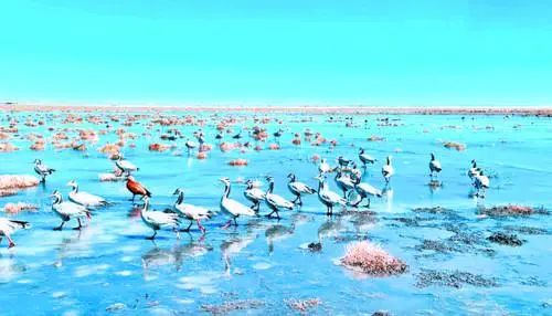 天氣晴朗時(shí),佇立湖邊的山崗上俯瞰湖心,好似一塊無瑕的翡翠。如果你來到這里,可飽覽遠(yuǎn)處草原的天空深邃如井,云如裙裾;近處的湖面上,鳥飛魚躍,這些美景定會讓你流連忘返。
