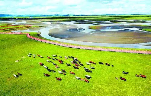 在這片濕地上,黃河的支流蜿蜒曲折,形成各式各樣的曲線。陽光下,這些彎彎曲曲的大小沼澤,猶如一條條銀色的絲帶,閃閃發(fā)光。觸手可及的藍(lán)天白云無際無涯,像洗滌過似的,亮得耀眼,牛羊滿山坡,宛如散落在人間的珍珠。這種原始的自然美景和豐富的生態(tài)資源,讓阿萬倉濕地成為一個(gè)理想的旅游目的地。