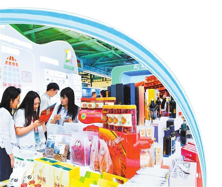 張掖館內(nèi),各類特色農(nóng)產(chǎn)品受到人們的青睞。 新甘肅·甘肅日報記者 馬伊星