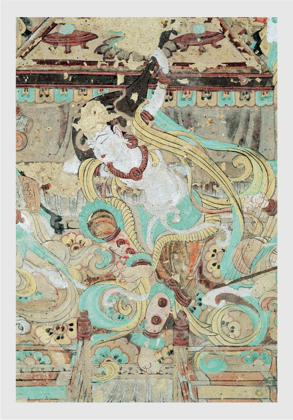畫面中的人物造型嚴格遵循唐代仕女的畫風繪制,顯得豐腴飽滿,恰似盛唐時期雍容華貴的氣質寫照。線描寫實明快,流暢飛動,一氣呵成,仿佛是畫師用靈動的筆觸在墻壁上勾勒出的生命樂章。畫面的顏色以石綠、赭黃、鉛白為主色。整個畫面顯得典雅、嫵媚,令人賞心悅目。雖然伎樂天頭部原本貼金的頭飾已經(jīng)剝落,但歲月的痕跡并未減損她雍容華貴的氣質,反而更增添了一份歷史的厚重感。