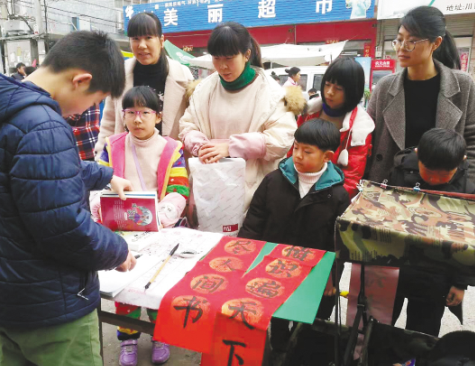 疫情之前,王子悅(左一)在集市上寫對聯送給借書的小朋友。