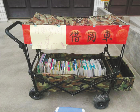 早上9點左右,自助借閱車從外婆家推出門,天黑了再推回來。看到想讀的書,讀者自行登記書名和個人信息,留下聯系方式,就能把書借回家。