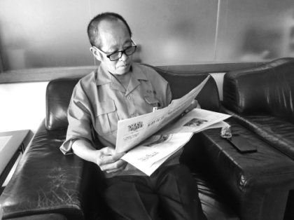 吳桂春在讀報。
