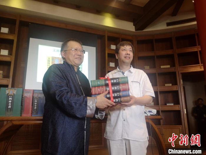 中新網(wǎng)杭州8月26日電(童笑雨)8月26日,浙江圖書館(下稱“浙圖”)向中國國家圖書館(下稱“國圖”)贈送影印精裝本文瀾閣《四庫全書》。據(jù)悉,影印本文瀾閣《四庫全書》入藏國圖,尚屬首次。浙江圖書館館長褚樹青表示,文瀾閣本《四庫全書》重新回到北京,是浙江人民的回贈,也是一次文化交流。