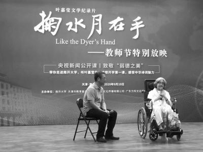 九月十日教師節(jié),南開(kāi)大學(xué)舉辦《掬水月在手》影片首映式。葉嘉瑩先生是國(guó)際儒聯(lián)榮譽(yù)顧問(wèn),我銜命陪同王念寧副會(huì)長(zhǎng)專(zhuān)程赴南開(kāi)致賀,有幸在南開(kāi)禮堂聆聽(tīng)九十六歲高齡的迦陵先生與白巖松共話(huà)詩(shī)意人生。迦陵先生坐在輪椅上娓娓道來(lái),鬢發(fā)皤然,聲如洪鐘,風(fēng)華絕代。