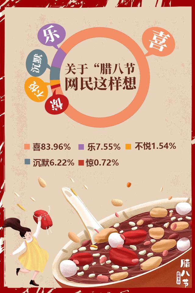 雖然今年多地的臘八節(jié)活動(dòng)因疫情而取消,但是人們對(duì)于團(tuán)圓、祥和、富裕、康寧、平安的期盼從未改變。有關(guān)“臘八”的網(wǎng)民情緒分布中,“喜”占83.96%,“樂(lè)”占7.55%。總體來(lái)說(shuō),開(kāi)心喜悅的情緒占到了九成以上。