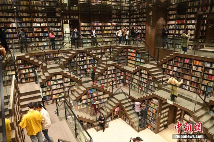 資料圖:重慶九龍坡區(qū)商圈內(nèi),一書(shū)店因設(shè)計(jì)感非常獨(dú)特,吸引了不少民眾前來(lái)打卡玩耍。陳超 攝