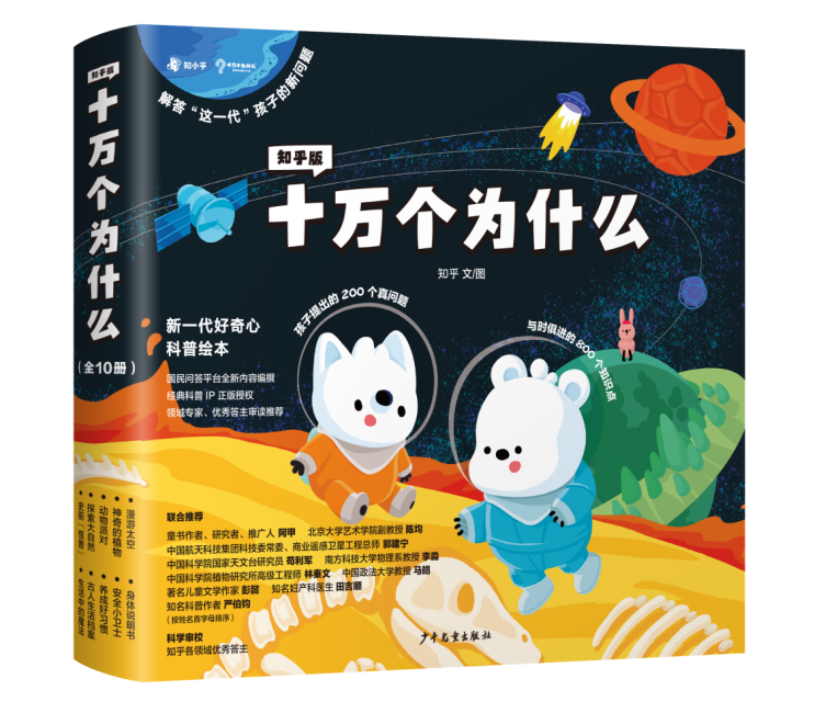 不是所有的科普讀物,都能叫《十萬個為什么》。1961年至今,《十萬個為什么》累計發(fā)行量近2億冊,是至今仍未被超越的現(xiàn)象級科普圖書。這套書在普及和傳播科學知識方面,發(fā)揮了非常積極的作用,影響了中國幾代青少年,堪稱是新中國影響力最大的青少年科學啟蒙讀物。作為國民級科普經(jīng)典,《十萬個為什么》誕生至今已經(jīng)60多年。盡管已經(jīng)有了之前版本的《十萬個為什么》,但是時代是不斷進步的,特別是進入數(shù)碼時代以后,孩子們比以往的所有時代,擁有著更多的信息和知識,腦袋瓜里也萌發(fā)著更新的問題和疑惑。他們發(fā)出的越來越多“超綱”問題,是以前的課本、科普書上沒有的,也讓父母們經(jīng)常面對“不知如何作答”的情況。新的“為什么”,需要新的解答。在少兒經(jīng)典科普《十萬個為什么》出版60周年之際,知乎攜手上海少年兒童出版社,收集當代孩子的真問題,邀請各領域機構(gòu)和專家為孩子們寫下新答案,推出了全新的知乎版《十萬個為什么》,盡量讓孩子們的問題都有答案。