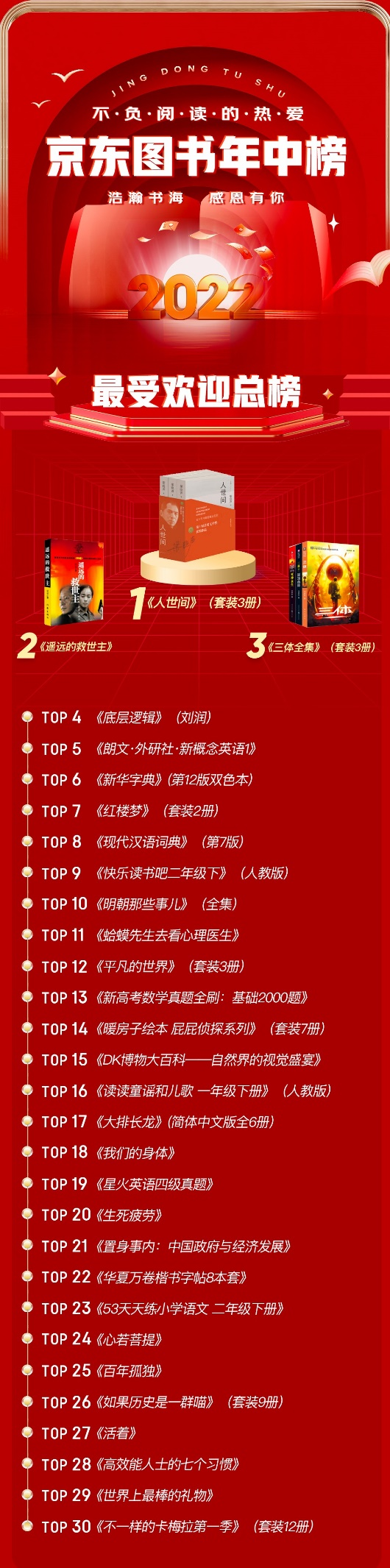 近日,京東圖書(shū)發(fā)布了2022年中圖書(shū)暢銷(xiāo)榜,包括總榜、新書(shū)榜,以及文學(xué)、經(jīng)管、童書(shū)、社科、科技、勵(lì)志、生活、藝術(shù)、文教、考試等10個(gè)類(lèi)別的分榜,每個(gè)榜單均有30種圖書(shū)入榜,入榜圖書(shū)總數(shù)超過(guò)300種。