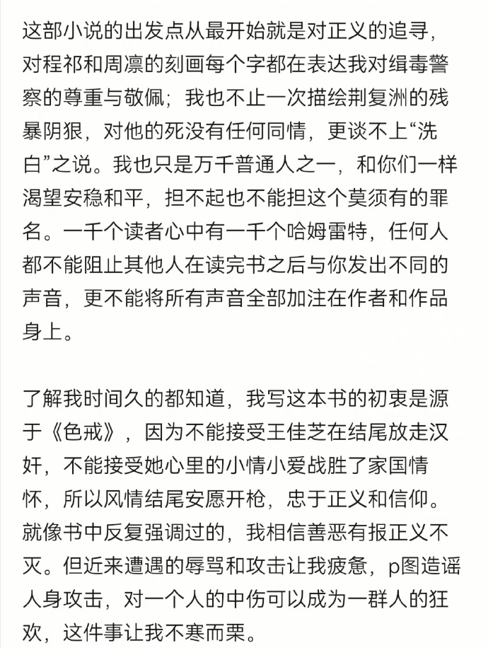在去年10月14日,疑似《風情不搖晃》的作者在其未經(jīng)認證的社交媒體賬號上表示,“小說的出發(fā)點是對正義的追尋”。在發(fā)布這條內(nèi)容后,其賬號再未更新,該條微博也關閉了評論。