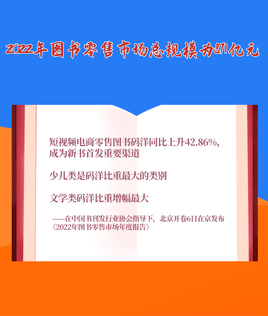 1月6日,在中國書刊發(fā)行業(yè)協(xié)會指導(dǎo)下,北京開卷信息技術(shù)有限公司在京發(fā)布《2022年圖書零售市場年度報(bào)告》。報(bào)告顯示,2022年我國圖書零售市場碼洋規(guī)模為871億元。短視頻電商零售圖書碼洋同比上升42.86%,碼洋占比趕超實(shí)體書店,成為新書首發(fā)重要渠道。