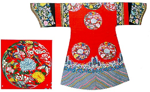 故宮藏大紅緙絲彩繪八團梅蘭竹菊紋夾袍及紋樣 選自《遇見中國服飾藝術》