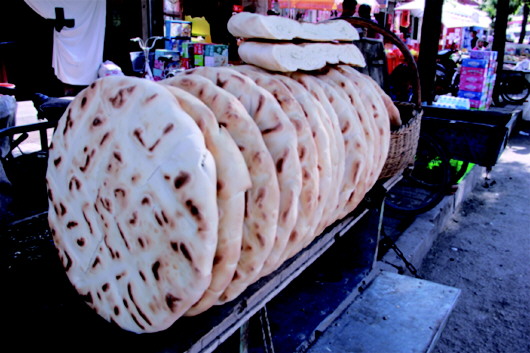 將面粉中加入一定比例的堿水,調(diào)和成面團(tuán)揉入早發(fā)酵好的面團(tuán),然后再添入大量干面,接下來才是關(guān)鍵所在:用堅(jiān)硬、光滑、沉重的木頭杠子一頭固定(形如杠桿),一頭人工操作,反復(fù)揉壓面團(tuán),直到將干面團(tuán)壓成綢子一樣綿軟,再切成1斤、2斤或3斤的面劑子,搟成圓餅狀,抹上清油,撒上少許鹽和胡椒、苦豆、姜黃等佐料,最后將面餅卷起來,豎立壓制成團(tuán),再用木杠搟壓成厚而大的圓餅,并在上面用干凈的梳齒等工具精心旋出花紋圖案,抹少許清油,便可上鏊烘烤。