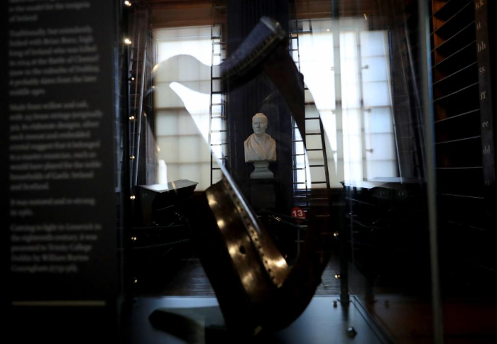這是在愛(ài)爾蘭都柏林大學(xué)圣三一學(xué)院老圖書(shū)館拍攝的豎琴和雕像(1月16日攝)。