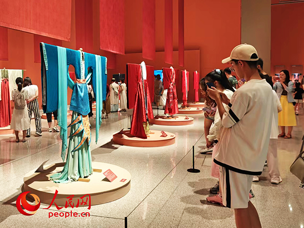 7月20日,正值周末,中國(guó)工藝美術(shù)館(中國(guó)非物質(zhì)文化遺產(chǎn)館)“五彩錦簇——中華服飾文化展”的展廳里人流如織。有人舉起手機(jī)拍照留念,有人駐足了解精湛的織造工藝,還有人在與同伴討論哪里能買(mǎi)到“同款”衣裝……這場(chǎng)中華服飾的視覺(jué)盛宴,讓眾多游客沉浸其中。