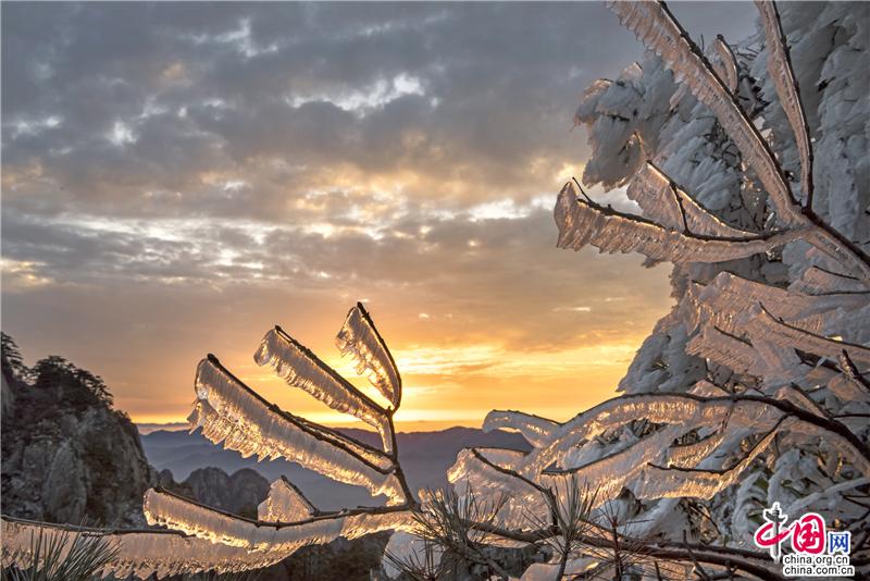 2019年最后一天黃山風(fēng)景區(qū),出現(xiàn)壯觀的日出、霧凇、云海景觀,到處銀妝素裹,冰雕玉砌,“一夜寒風(fēng)起,萬樹銀花開”,置身其間,仿佛進(jìn)入撲朔迷離的童話世界,給來山的游客帶來意外的驚喜。