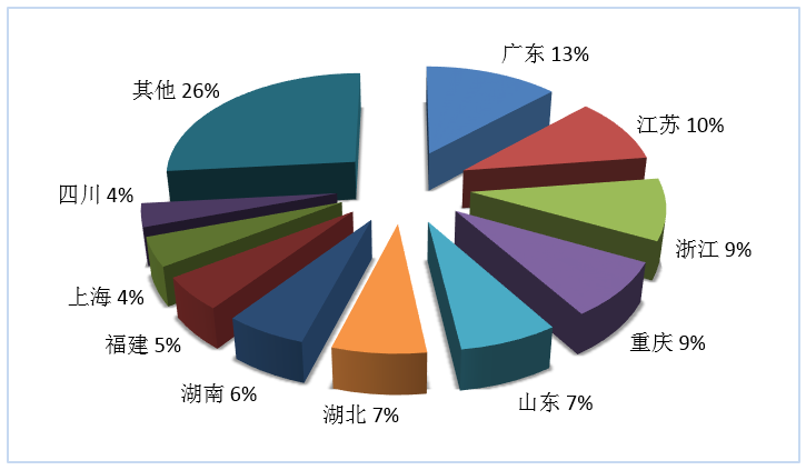第三季度旅行社國(guó)內(nèi)旅游組織人次排名前十位的地區(qū)由高到低依次為廣東、江蘇、浙江、重慶、山東、湖北、湖南、福建、上海、四川(見圖3)。