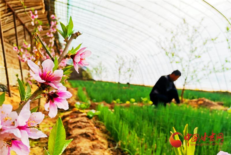 走進(jìn)敦煌市月牙泉鎮(zhèn)現(xiàn)代采摘園區(qū)農(nóng)民陶寶憲的溫室大棚,粉紅的桃花開得正艷,濃濃春意撲面而來,在花香的陪伴下,陶寶憲在大棚中辛勤勞作。