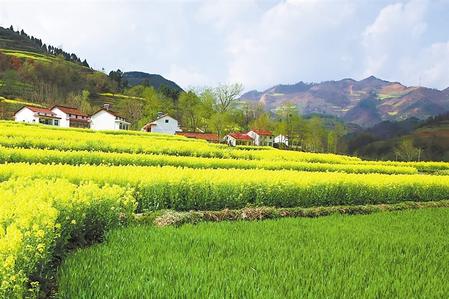 山巒蠢蠢欲動(dòng)起來,卻比不過一些趕著腳步的植物,或許,它們還要頹敗一些時(shí)日。山腳處的田間,一片片油菜花泛動(dòng)金色的光芒,為山巒繡上彩色的裙邊,散落在田壟之中的農(nóng)舍瓦屋靜默在時(shí)光里,安逸、祥和,讓人向往。