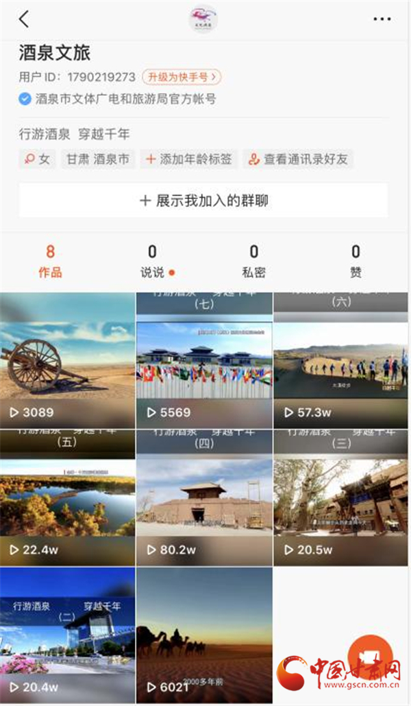 “酒泉文旅”快手官方賬號截圖