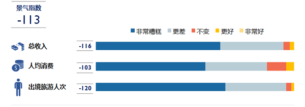 《報(bào)告》指出,受疫情影響,從業(yè)者對2020年上半年出境旅游市場的整體業(yè)績預(yù)期極為悲觀。與去年同期相比,景氣指數(shù)大跌113個(gè)指數(shù)點(diǎn),至-113。同時(shí),出境旅游人次、人均消費(fèi)及總收入三項(xiàng)指標(biāo)的市場預(yù)期較2019年上半年均有大幅下滑,其中受疫情于全球蔓延的影響,從業(yè)者對出境旅游人次的預(yù)期負(fù)面性最高。