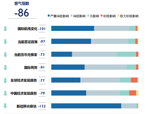 整體而言,從業(yè)者預(yù)期以上7項(xiàng)因素均將對2020年上半年出境旅游市場業(yè)績產(chǎn)生負(fù)面影響,導(dǎo)致整體景氣指數(shù)下降至-86。其中,正于全球蔓延的新冠疫情被認(rèn)為是限制出境旅游市場發(fā)展的最主要因素。