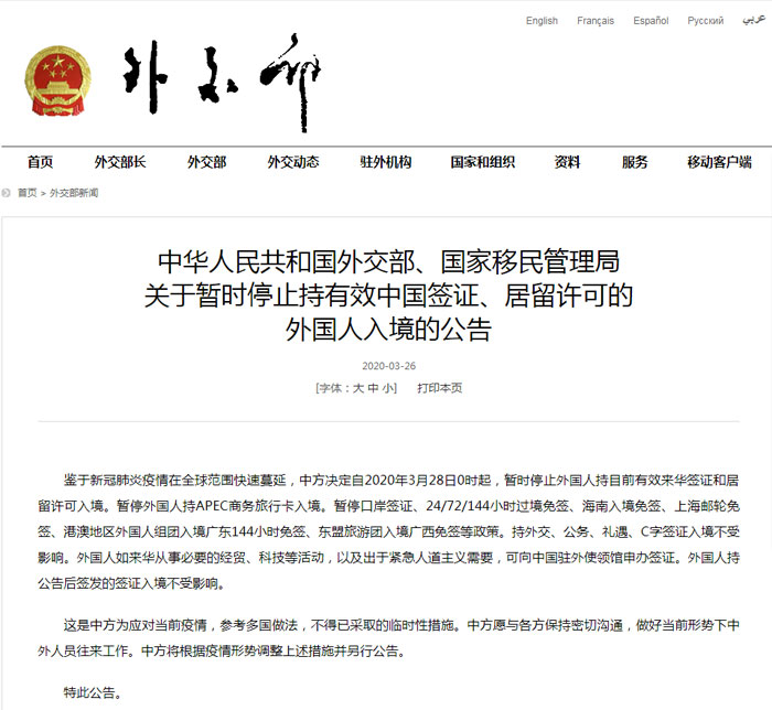 3月26日,中華人民共和國(guó)外交部、國(guó)家移民管理局發(fā)布《關(guān)于暫時(shí)停止持有效中國(guó)簽證、居留許可的外國(guó)人入境的公告》(以下簡(jiǎn)稱《公告》),決定28日起,暫時(shí)停止外國(guó)人持目前有效來(lái)華簽證和居留許可入境。