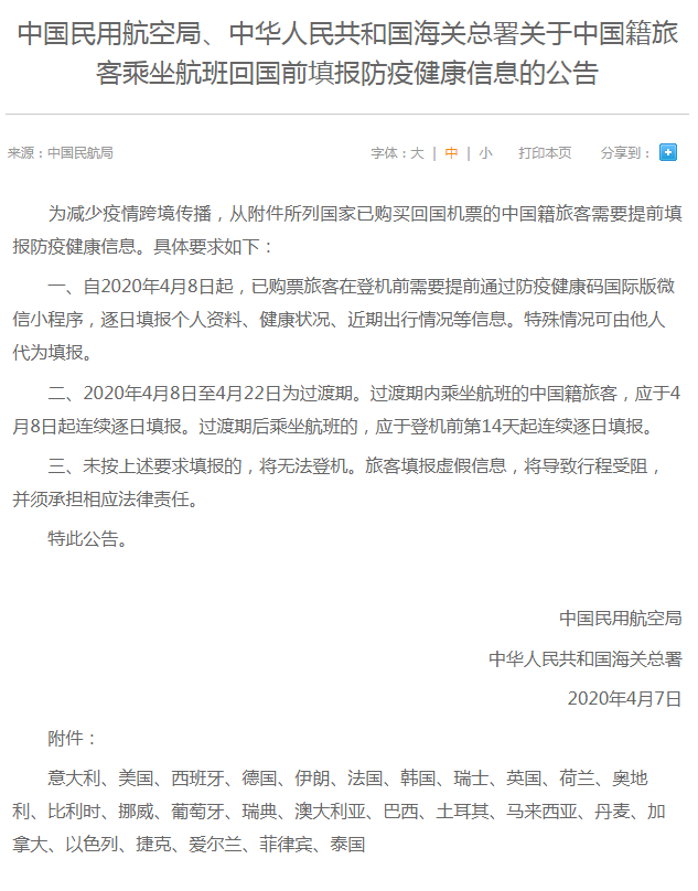中國(guó)民用航空局、中華人民共和國(guó)海關(guān)總署4月7日聯(lián)合發(fā)布《關(guān)于中國(guó)籍旅客乘坐航班回國(guó)前填報(bào)防疫健康信息的公告》(以下簡(jiǎn)稱《公告》)。《公告》指出,自4月8日起,從意大利、美國(guó)、西班牙等26個(gè)國(guó)家已購(gòu)買(mǎi)回國(guó)機(jī)票的中國(guó)籍旅客需要在登機(jī)前提前填報(bào)防疫健康信息,包括逐日填報(bào)個(gè)人資料、健康狀況、近期出行情況等。旅客未按要求填報(bào)的,將無(wú)法登機(jī);填報(bào)虛假信息,將導(dǎo)致行程受阻,并須承擔(dān)相應(yīng)法律責(zé)任。