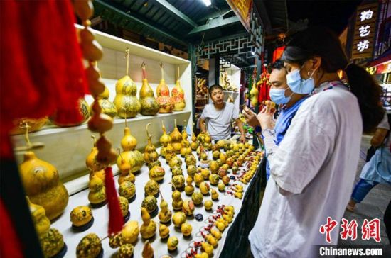 圖為游客購買刻葫蘆工藝品?!⊥醣筱y 攝