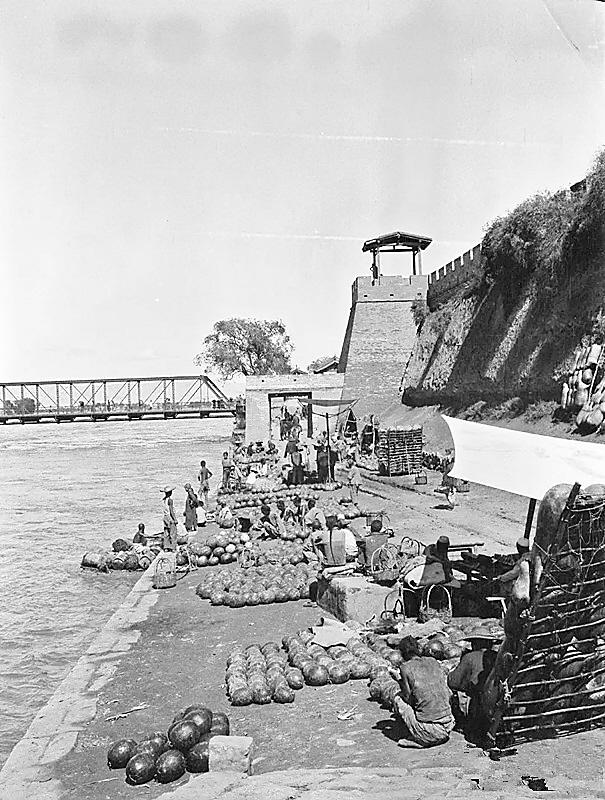 第三張照片,拍攝地點(diǎn)在黃河鐵橋附近,這是一處碼頭,一些人忙碌著卸西瓜,一些人靠著羊皮筏子等著人們渡河。小吃攤打著篷布,三三兩兩的人圍坐在那里,似乎是在吃釀皮子。照片上,遠(yuǎn)處是黃河鐵橋,看上去黃河水距離鐵橋的橋面比較近。由此看來(lái),黃河的水量不小。