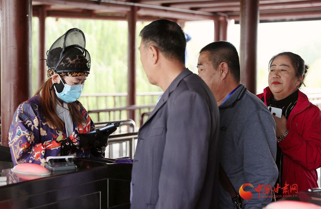 9月22日,記者在嘉峪關(guān)關(guān)城看到前來參觀的游客絡(luò)繹不絕,大家跟隨漢服飄逸的講解員沿著關(guān)城前行。在甕城感受“甕中捉鱉”的境遇,在關(guān)口倒換通關(guān)文牒尋求關(guān)照。一路上都能遇到穿著明朝服飾的工作人員,將人們帶入大明風(fēng)華的場景之中。