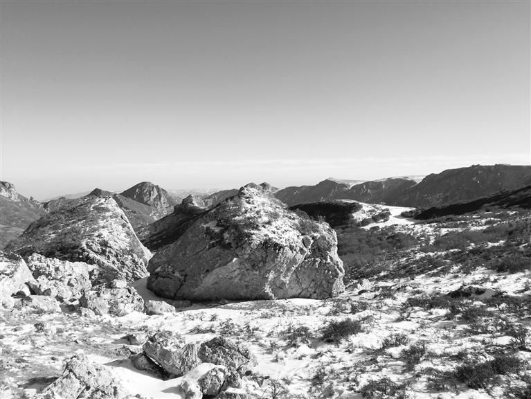 穿過公路就來到露骨山腳下,山間灌木叢生,枯葉凋零,一夜的小雪也使天空更加清澈。上山的路,總體是溯溪而上,不過腳下的小溪已經(jīng)變成冰河,但潺潺水聲不時(shí)在耳邊響起,大小石塊橫亙在冰河之上,白雪覆蓋其間,我們一行沿著前人在雪地留下的腳印,撥開齊胸的灌木枝,深一腳淺一腳、兜兜轉(zhuǎn)轉(zhuǎn)向前行。