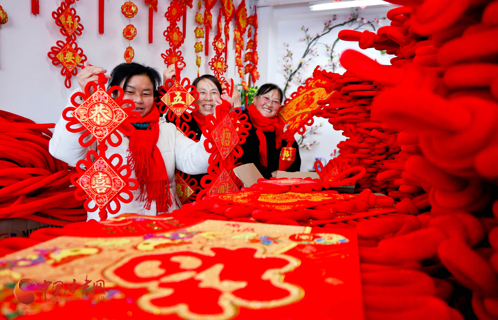 1月6日,甘肅民樂(lè)生態(tài)工業(yè)園區(qū)的巾幗扶貧車(chē)間內(nèi),編織女工正在緊張忙碌地抓緊編織中國(guó)結(jié),供應(yīng)節(jié)日市場(chǎng),喜迎新春。
