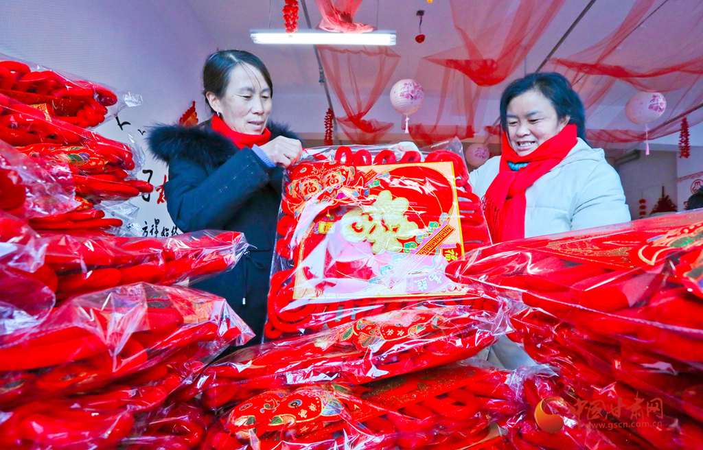 1月6日,甘肅民樂(lè)生態(tài)工業(yè)園區(qū)的巾幗扶貧車(chē)間內(nèi),女工們?cè)诎b編織好的中國(guó)結(jié)準(zhǔn)備發(fā)運(yùn)。