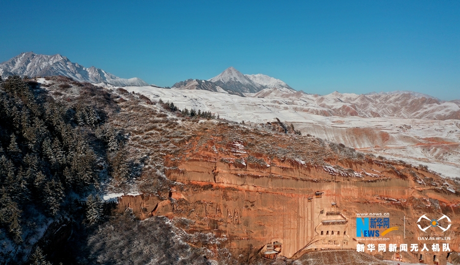 當(dāng)日,雪霽初晴的甘肅省張掖市肅南裕固族自治縣馬蹄寺風(fēng)景區(qū),松海翠柏銀裝素裹,與丹霞峭壁上的石窟相互映襯,如一幅美麗畫卷。