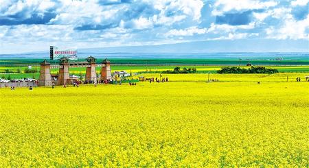 沿著國(guó)道227行走,放眼望去,遠(yuǎn)處祁連山脈高峰聳立,近處起伏的山丘高低錯(cuò)落,山間綠草如茵,色彩斑斕的野花星星點(diǎn)點(diǎn)播撒在綠草之中。山坡上點(diǎn)綴的牛羊安靜地吃草,呈現(xiàn)出一派安靜祥和的田野風(fēng)光。最耀眼的當(dāng)屬這里的油菜花,處處可見(jiàn)金黃一片,成為七月河西走廊一道亮麗的風(fēng)景。