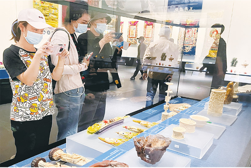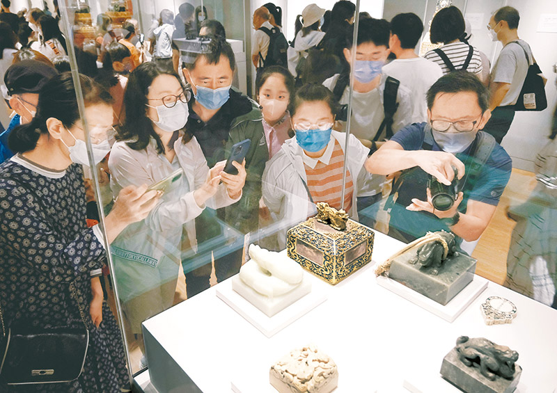 2022年7月3日,香港故宮文化博物館正式對(duì)公眾開放參觀。圖為觀眾在香港故宮文化博物館展廳內(nèi)參觀拍照?!⌒氯A社記者 王申/攝