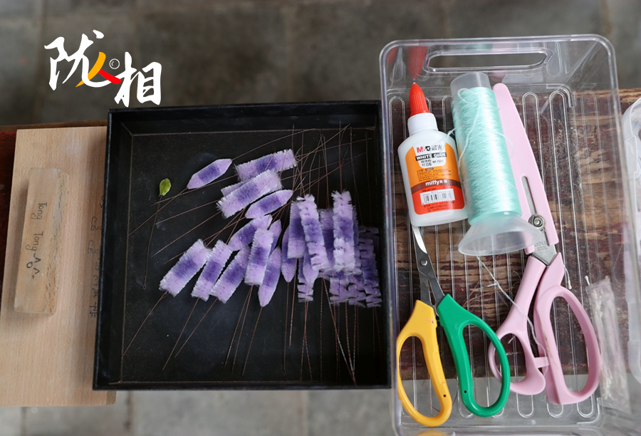 排線、栓銅絲、裁剪寬度、勾挑搓絲、打尖、傳花,每一個(gè)制作過程都需要耐心,制作一朵簪花少說也要一周時(shí)間。對于宗怡彤來說,學(xué)會簪花,也就學(xué)會了靜下心來面對一切,在沉浸的時(shí)光,心無旁騖,才能享受最終的賞心悅目。
