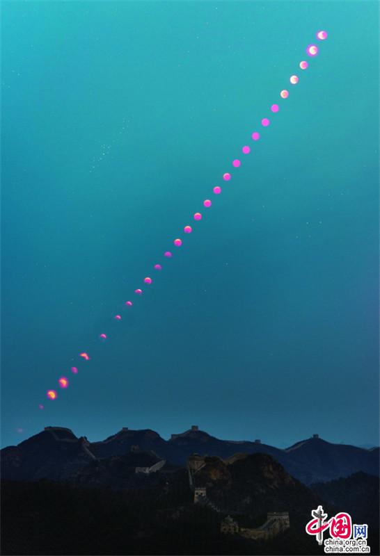 11月8日,月全食(紅月亮)天象驚艷亮相金山嶺長(zhǎng)城。(紀(jì)正權(quán) 張愛東