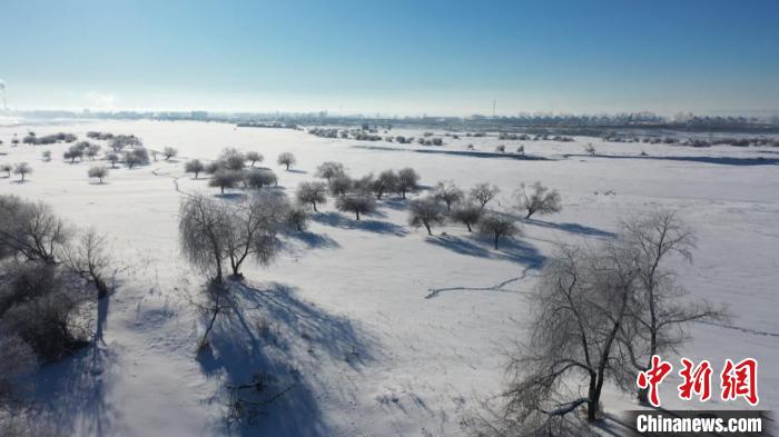 在霧氣的作用下,黑龍江江畔的樹(shù)木都披掛了一層冰晶,原本綠色的松柏覆蓋上了一層白紗。遠(yuǎn)遠(yuǎn)望去,一排排青松、楊樹(shù)、柳樹(shù)的樹(shù)冠似煙似霧,與藍(lán)天相接,形成了難得一見(jiàn)的霧凇美景,吸引了許多當(dāng)?shù)鼐用耨v足拍照。